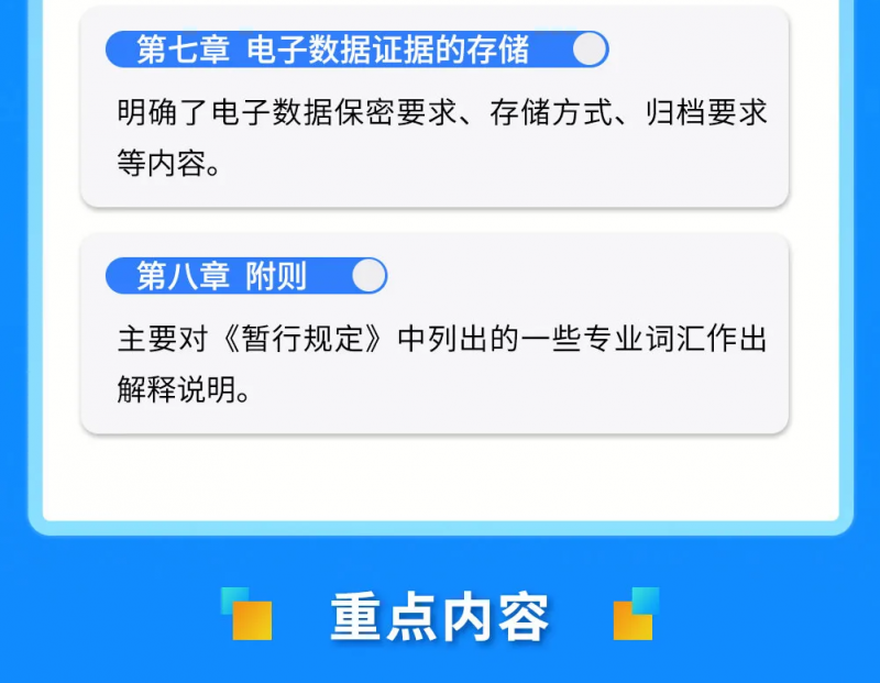 《暂行规定》共八章三十六条,严格对照《中华人民共和国行政处罚法》《市场监管行政处罚程序规定》等内容,重点在实操层面明确了电子数据取证固证适用情形、提取方法和相关要求。