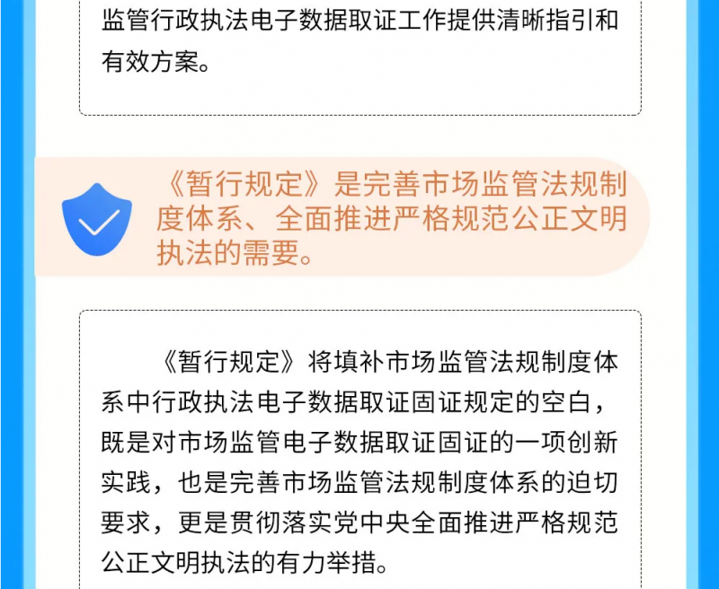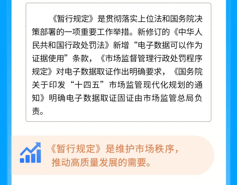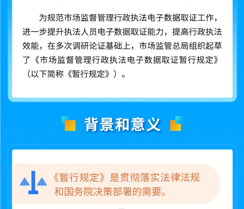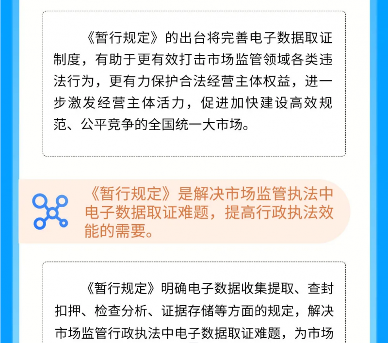 为规范市场监督管理行政执法电子数据取证工作,进一步提升执法人员电子数据取证能力,提高行政执法效能,市场监管总局近日发布《市场监督管理行政执法电子数据取证暂行规定》(以下简称《暂行规定》),于2024年4月7日起正式施行。