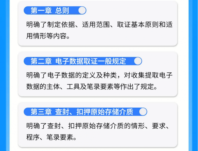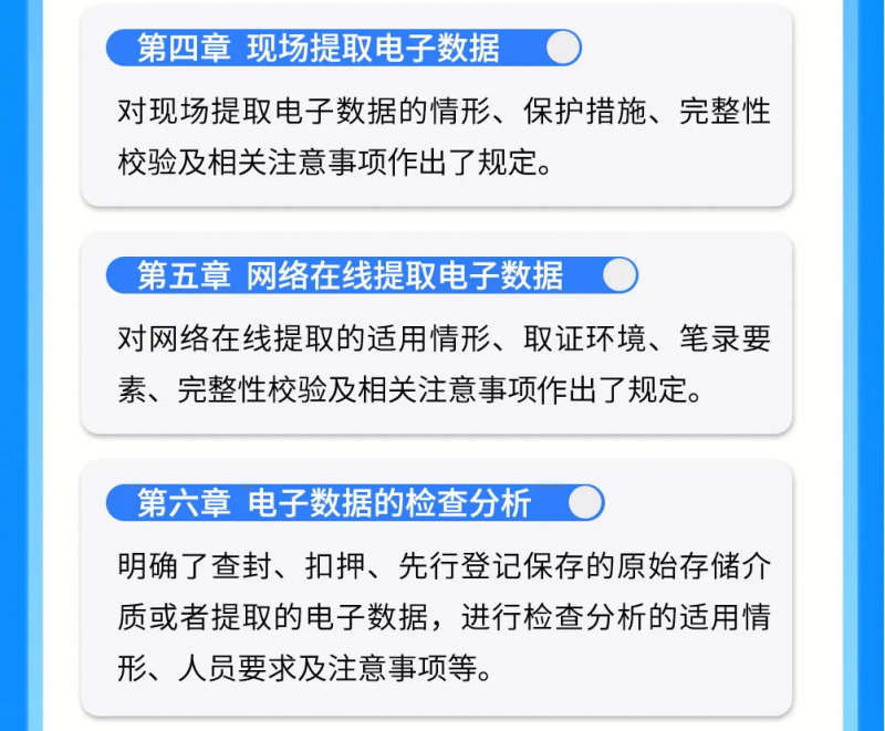 02、明确了电子数据取证适用场景。结合执法实际,《暂行规定》分别规定了现场提取电子数据,网络在线提取,查封、扣押原始介质,电子数据检查分析及电子数据证据的储存等多种适用场景,同时详细规定了执法人员在不同场景下可行使的法定职权。可以通过截屏、录像、查封、扣押、先行登记保存等不同方式合法高效完成电子数据取证工作。