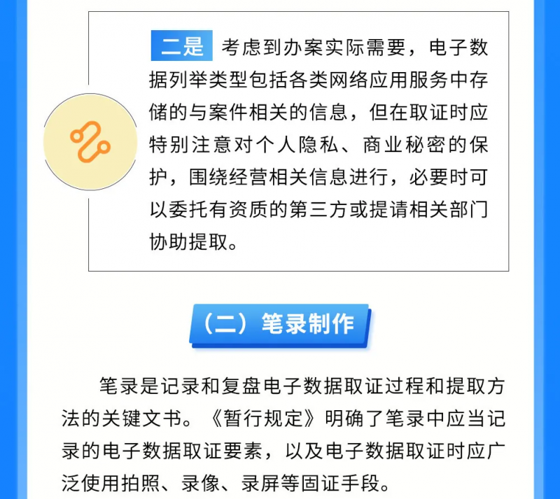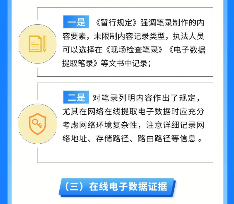 03、明确了电子数据取证需记录的要点。结合执法需要,《暂行规定》强调笔录制作的内容要素,执法人员可以在《现场检查笔录》《电子数据提取笔录》等文书中记录。同时对笔录中应列明的内容作了规定,明确了笔录内容要素和记录要点,为执法人员在制作笔录时指明应当记录的电子数据取证要素,明确电子数据取证步骤,有效避免因执法人员遗漏取证关键步骤,导致证据无效的问题。